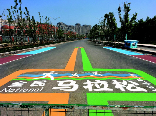 9月3日在华山生态湿地公园环湖路北段西边的快车道上,记者看到了自西向东延伸的全民马拉松字样的彩绘,字体外黄色和绿色的线条围合成了“泉”字,同时,快车道的外侧还有红色和蓝色的彩绘向东延伸。