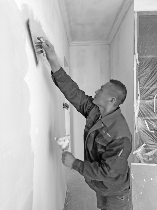 闫豹今年31岁,刚在老家济阳区买了房子。从2011年开始他就在济南从事水电工的工作。当然,作为一个小工头,抹墙、刷漆他样样都行。30日,记者在金域蓝山见到了正在装修的闫豹,个不高、很精瘦,干起活来很麻利,他的牛仔裤和上身的工装上还残留着不少腻子粉。