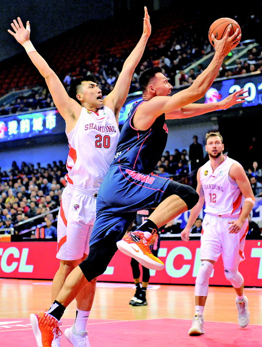 易建联在防守下奋力上篮。 本报记者 陈文进 摄