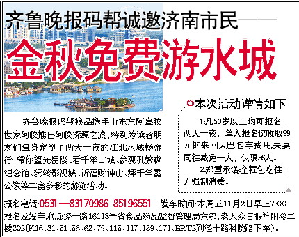齐鲁晚报码帮粮品携手山东东阿皇胶世家阿胶推出阿胶探源之旅,特别为读者朋友们量身定制了两天一夜的江北水城畅游行,带你望光岳楼、看千年古城、参观孔繁森纪念馆、玩转影视城、祈福财神山、拜千年雷公像等丰富多彩的游览活动。