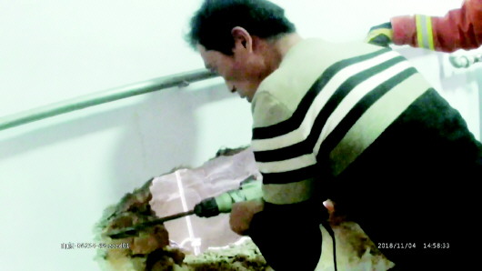 ◤村民携带破拆工具加入到救援中,与消防救援人员一起对墙壁进行破拆,以扩大作业面积。