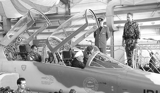 8月21日,在伊朗德黑兰,伊朗总统鲁哈尼出席全国国防工业展期间查看“考萨尔”战机驾驶舱。