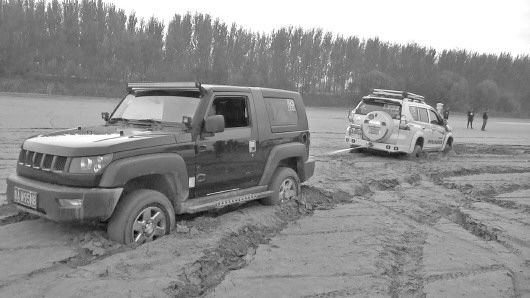 傍晚6点左右,白色三菱越野车被大家拖出来,但很快第二次被陷,又被拖出。截止到晚上7点,队员石岩的越野车和另一辆私家车因陷得太深,又没有合适的工具,众人只好暂时放弃,等待第二天再施救。
