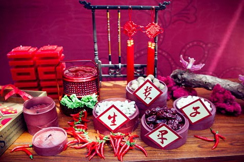 婚宴是最隆重的,菜自然是按老济南规矩:先是四碟黑白瓜子糖块、四碟水果、四碟点心;接着是四冷盘时令蔬菜、八热盘硬菜,即猪脸、猪耳、猪口条、猪心、猪肝、猪小肚、猪蹄、猪大肠;再上清蒸鸡、海参扒肘子、四喜丸子、糖醋鲤鱼四个大件,另配八个炒菜。过去提亲一般都是三里五庄,相距不会太远,多有亲戚朋友相识,喝三杯喜酒便会打得火热,席间断不了互相问候,推杯换盏,猜拳行令。直到堂屋点灯才恋恋不舍上汤吃饭。