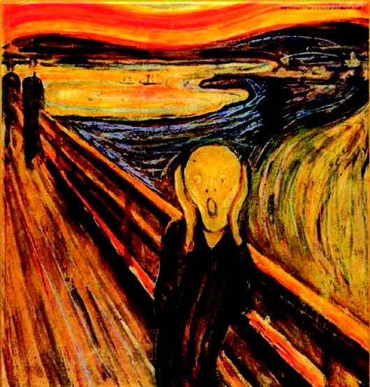 这是十九世纪挪威画家蒙克的名作《呐喊》。画面恐怖,图画中一个人,不如说是一个幽灵双手捂住耳朵,双目圆睁,嘴大大地张着。我们似乎听到了从那张嘴里发出的呐喊。
