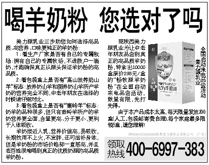 现陕西美力源乳业为让中老年朋友品尝到真正的高品质羊奶粉,特拿出10000盒原价298元/盒的“畅牧源羊奶粉”在全国启动来电品尝活动,数量有限,先打先得。