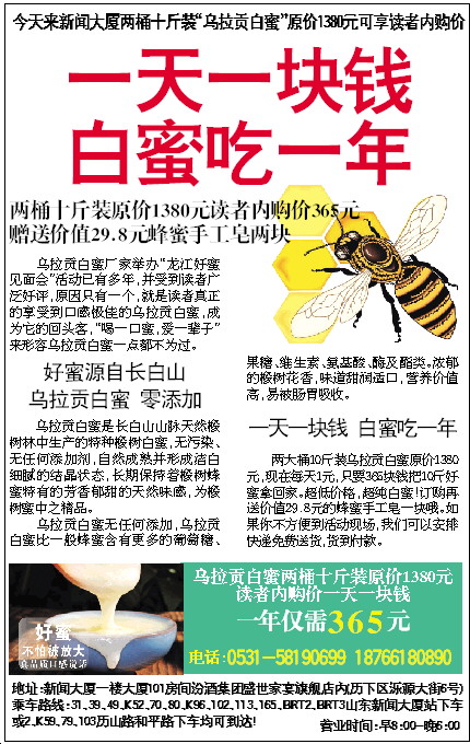 今天来新闻大厦两桶十斤装“乌拉贡白蜜”原价1380元可享读者内购价