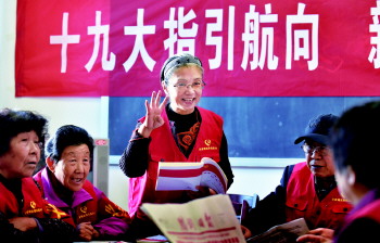 ◥胜利油田非在职党员利用党员服务社宣讲《十九大指引航向》。 通讯员 朱克民 摄