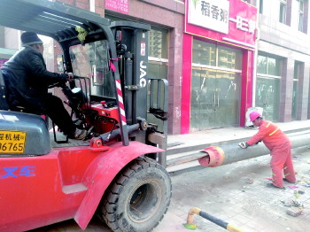 金色家园门口热力施工人员正运走管道。