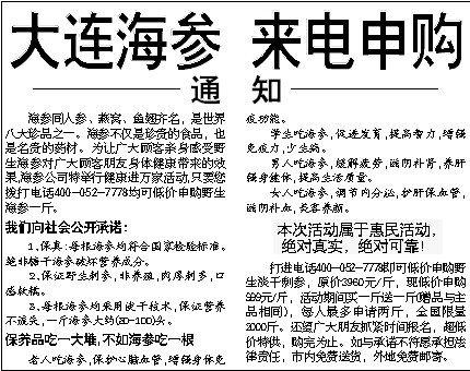 海参同人参、燕窝、鱼翅齐名,是世界八大珍品之一。海参不仅是珍贵的食品,也是名贵的药材。为让广大顾客亲身感受野生海参对广大顾客朋友身体健康带来的效果海参公司特举行健康进万家活动只要您拨打电话400-052-7778均可低价申购野生海参一斤。