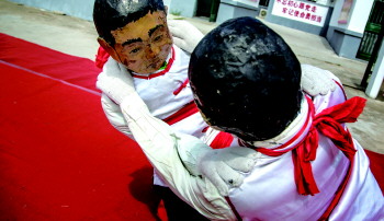 吴忠东说,过去“跋跌”是由两个真人摔跤,慢慢的演变到现在,靠一个人操纵道具表演两人摔跤时的情景。演出时,在锣鼓有节奏的声音伴奏下,表演者背着两个道具假人,两只胳膊穿上鞋子,趴在地上,背着两个假人并作出摔跤动作,好似两人正在扭打,腾、挪、跳、摔,姿态逼真,现场十分诙谐和幽默。