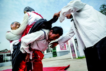 在演出的时候,老吴需要在同伴的帮助下穿上道具。