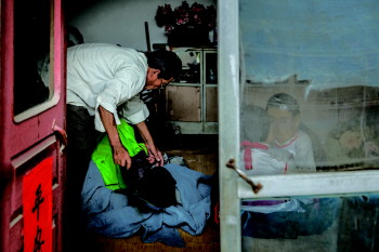在演出的时候,另一演员身着假人道具,表演“张老背老婆”看“跋跌”,两人密切配合生动传神!