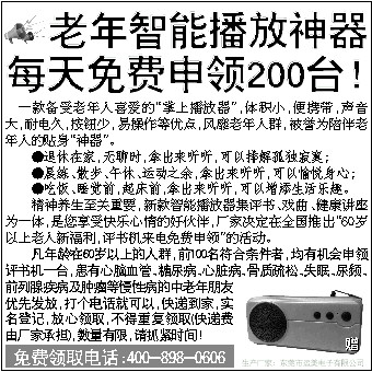 精神养生至关重要,新款智能播放器集评书、戏曲、健康讲座为一体,是您享受快乐心情的好伙伴,厂家决定在全国推出“60岁以上老人新福利,评书机来电免费申领”的活动。