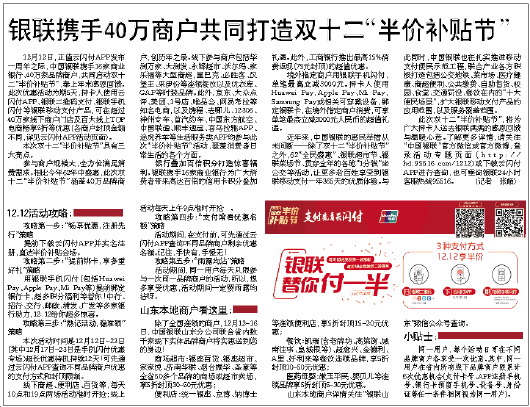此次双十二“半价补贴节”,将为广大持卡人送去银联满满的感恩回馈与温暖心意。了解更多详情,请关注“中国银联”官方微信或官方微博,登录活动专题页面(http://hd.95516.com/1212)或下载云闪付APP进行查询,也可垂询银联24小时客服热线95516。 (记者 张頔)