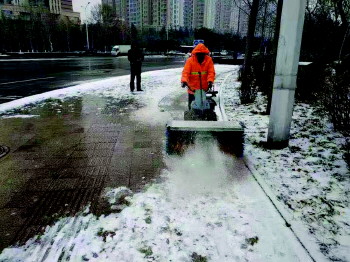 在北海路扫雪除冰现场,环卫部门采取小型扫雪车与人工清扫相配合的方式对人行道积雪进行清理,提高了扫雪效率;在高新区扫雪除冰现场,专业的人行道清雪车清扫过后,路面瞬间洁净。今年,市区各区环卫部门提早准备,积极采购各式新型扫雪除冰设备,大大提高了扫雪效率,减轻了环卫工人的工作强度。