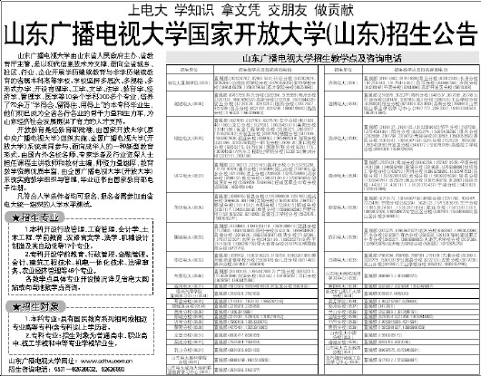 山东广播电视大学由山东省人民政府主办、省教育厅主管,是以现代信息技术为支撑,面向全省城乡、社区、行业、企业开展学历继续教育与非学历继续教育的省属本科高等学校。学校坚持多层次、多规格、多形式办学,开设有理学、工学、文学、法学、教育学、经济学、管理学、医学等10余个学科100多个专业,培养了70余万“学得会、留得住、用得上”的本专科毕业生,他们现已成为全省各行各业的骨干力量和生力军,为山东经济社会发展提供了有力的人才支持。