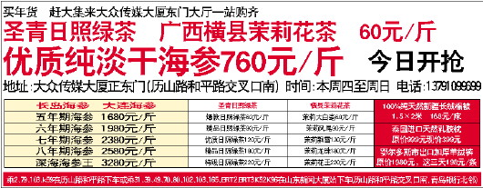 七年期海参 2380元/斤 优质日照绿茶120元/斤 茉莉飘雪130元/斤