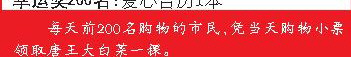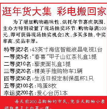 逛年货大集 彩电搬回家 来源:齐鲁晚报 2019年01月17日 为了增加购物趣味性,烘托年节喜庆氛围,主办方特别设置了现场抽奖环节:购物每满100元,即可获得现场抽奖机会1次,多买多抽,中奖率高,奖品丰厚。 特等奖2名:43英寸海信智能液晶电视1台一等奖5名:“春喜”甲子山红茶礼盒1提二等奖10名:藜麦面礼盒1提三等奖20名:精美手推购物车1辆四等奖50名:生活日报定制保温杯1只五等奖100名:鸡蛋8枚幸运奖200名:爱心台历1本 每天前200名购物的市民,凭当天购物小票领取唐王大白菜一棵。 本稿件所含文字、图片和音视频资料,版权均属齐鲁晚报所有,任何媒体、网站或个人未经授权不得转载,违者将依法追究责任。