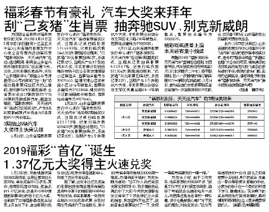 为回馈全省彩民对福彩刮刮乐的支持,2019年1月18日至2月19日(农历腊月十三至正月十五)山东省福利彩票发行中心在全省范围内启动第四季“福彩刮刮乐 天天送汽车”活动。活动期间,彩民在山东省内购买福彩刮刮乐“己亥猪”5元、10元、20元彩票任意品种,关注“山东福彩中心”微信公众号并使用公众号内部的“扫一扫”功能扫描彩票玩法区内的二维码,就可参与汽车抽奖活动,全省累计送出12辆奔驰SUV与26辆别克新威朗汽车。截至发稿前,“福彩刮刮乐 天天送汽车”活动已经抽奖3次,产生3名别克新威朗汽车得主与2名奔驰SUV汽车得主。