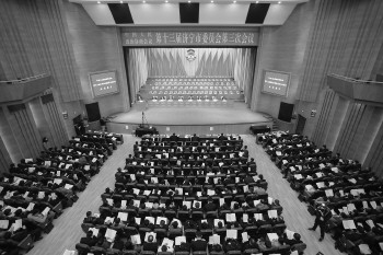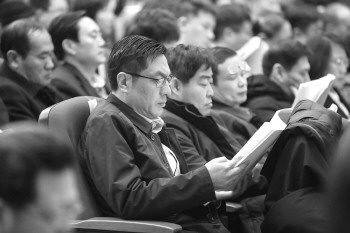 委员们正在边看边听议政发言。 本报记者 张清直 摄