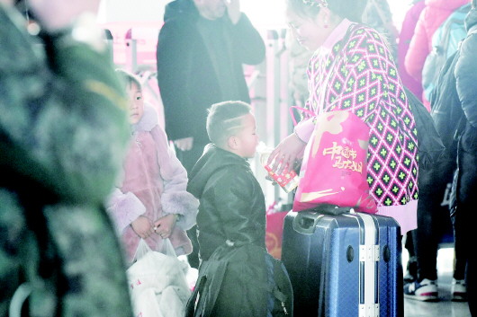 在胡先生的行李中,除了衣物以外,还装着几个大大的花糕。“这花糕有年年高升的意义,一是为图个好彩头,二是因为儿子最喜欢吃家乡的大枣,所以昨晚老伴连夜蒸好,给儿子带过去。”胡先生坦言,今年是第一年离家过年,但是想到能和儿子团聚,心里还是非常高兴。其实,只要一家人在一起,在哪里过年都一样。“孙女在德州上四年级了,想到马上可以见到父母,很兴奋。”