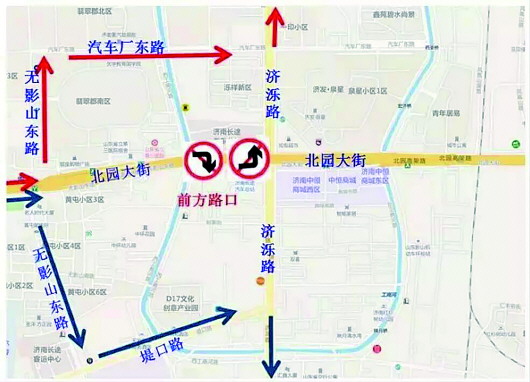 南向西车辆绕行方案:北园大街与济泺路交叉口直行—汽车厂东路与济泺路交叉口掉头—北园大街与济泺路交叉口右转;济泺路—堤口路—无影山东路—北园大街。