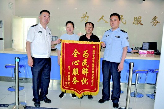 ◤田曾伟(右一)获赠锦旗。(资料片)