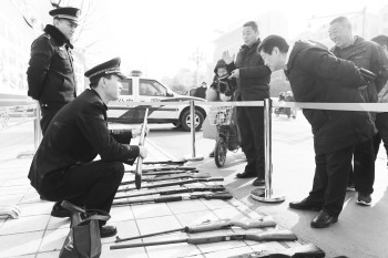 成果展上,市民观看收缴的枪支。
