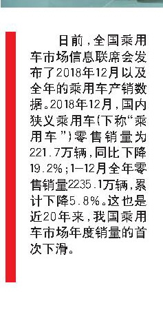 日前,全国乘用车市场信息联席会发布了2018年12月以及全年的乘用车产销数据。2018年12月,国内狭义乘用车(下称“乘用车”)零售销量为221.7万辆,同比下降19.2%;1-12月全年零售销量2235.1万辆,累计下降5.8%。这也是近20年来,我国乘用车市场年度销量的首次下滑。
