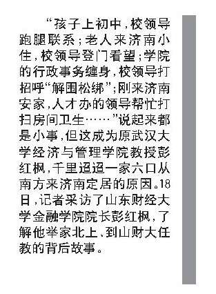 “孩子上初中,校领导跑腿联系;老人来济南小住,校领导登门看望;学院的行政事务缠身,校领导打招呼“解围松绑”;刚来济南安家,人才办的领导帮忙打扫房间卫生……”说起来都是小事,但这成为原武汉大学经济与管理学院教授彭红枫,千里迢迢一家六口从南方来济南定居的原因。18日,记者采访了山东财经大学金融学院院长彭红枫,了解他举家北上、到山财大任教的背后故事。