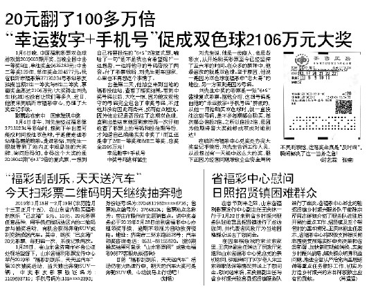 1月6日晚,中国福利彩票双色球游戏第2019003期开奖,当晚全国中出一等奖5注,单注奖金9635283元;中出二等奖129注,单注奖金224577元。我省临沂市福彩第37130234号彩站彩友独揽当期2注一等奖与8注二等奖,票面奖金高达2106万元!大奖得主刘先生(化姓)也没有让我们等多久,近日,他便来到临沂市福彩中心,办理了大奖登记手续。
