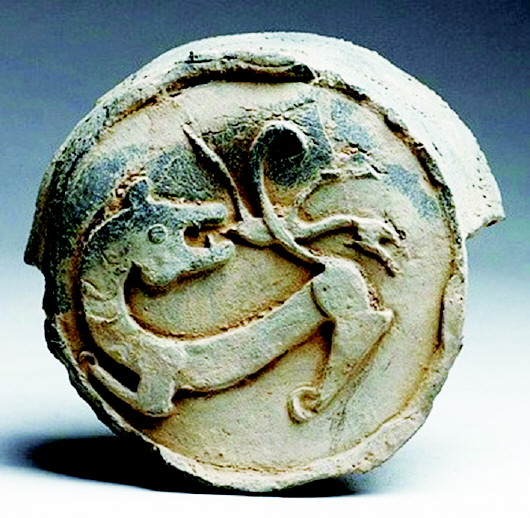 瓦当俗称瓦头,分半圆、全圆两种,其具有遮盖筒瓦前端、保护屋檐和利于排水等功能。瓦当最早出现于西周时期,以半圆素面形式居多,少有图案者则多以重环纹为主。春秋时期出现了绳纹瓦当,并开始用于宫殿建筑。到了战国时期,受地域特点的影响,图案样式丰富起来。如燕国易县的燕下都瓦当,出现了饕餮纹、卷云纹等。齐国则多以抽象与物象并存的瓦当纹饰为主。秦国因受先祖游牧生活的影响,瓦当多以鹿纹、双獾纹装饰。至秦始皇统一六国后,进行了史无前例的文化大一统。瓦当的图案在延续战国时秦国纹样的同时,融合其他六国的艺术特点,形成独特的艺术风格。其题材广泛、形式讲究整体与对称,赋有极强的装饰性。