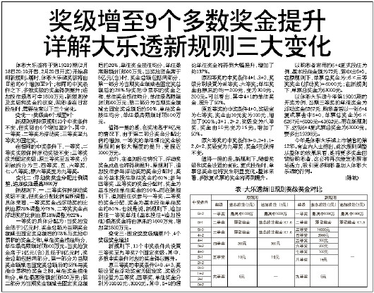 新规则保持原规则13个中奖条件不变,但奖级由6个增加至9个。其中,一等奖、二等奖为浮动奖;三等奖至九等奖为固定奖。