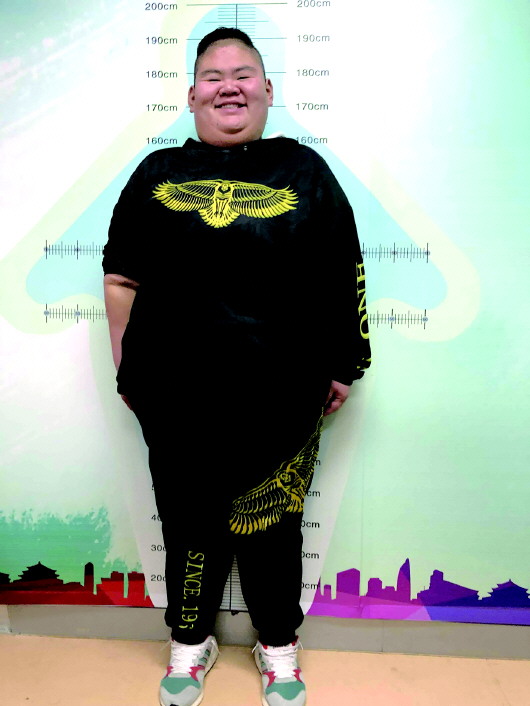 ◤12日,原668斤“第一胖”20岁的王浩楠进行半年复查,体重减至384斤。本报记者 张如意 摄