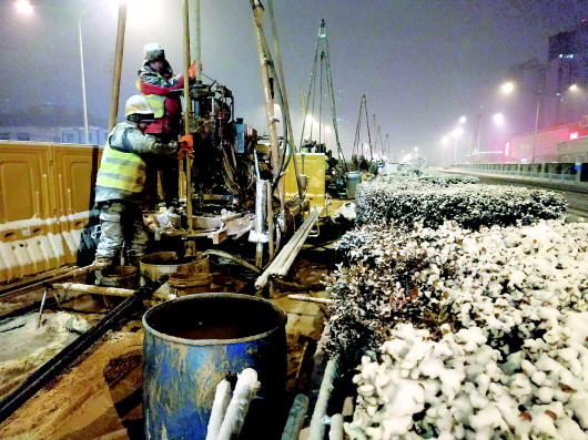 (下)14日零时许,雪在纷纷扬扬地下着,济南顺河高架路南延工地上,勘测工人冒雪开足马力加油干。