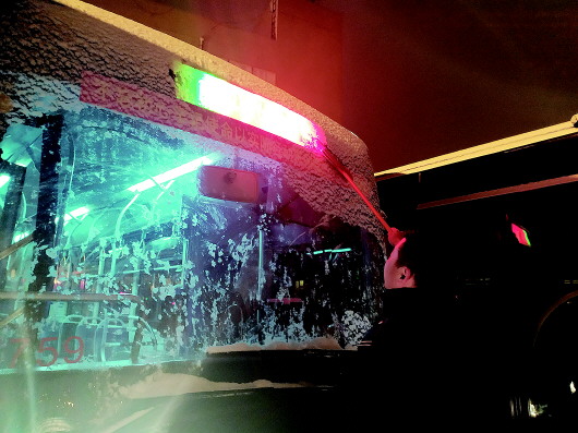(中)14日凌晨5时许,公交驾驶员王金川在清除玻璃上的积雪,为出车做好准备。 本报记者 刘飞跃 摄