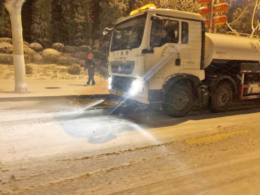 (上)14日凌晨2时许,经十路上一片忙碌景象。从13日傍晚开始,城管部门的洒水车、雪滚车已经全部在路上,天亮之前,主要道路的雪要清扫一遍。