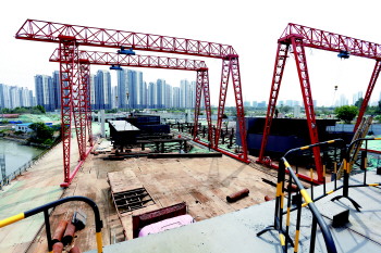 齐鲁晚报·齐鲁壹点记者登上已拼接完成的主体桥梁,发现一条蜿蜒宏伟的大桥已现雏形。“现在总体工程进展到75%,将尽快完成施工。”太白湖新区建设局市政处主任孙振国介绍,钢箱梁生产时,需要预先拼装后再解体涂装,随后通过运输,在现场吊装后精调,再焊接后涂装才行。钢箱梁拼装共分为五模,现在已完成三模,四模正在加紧施工,而五模正在加快生产。