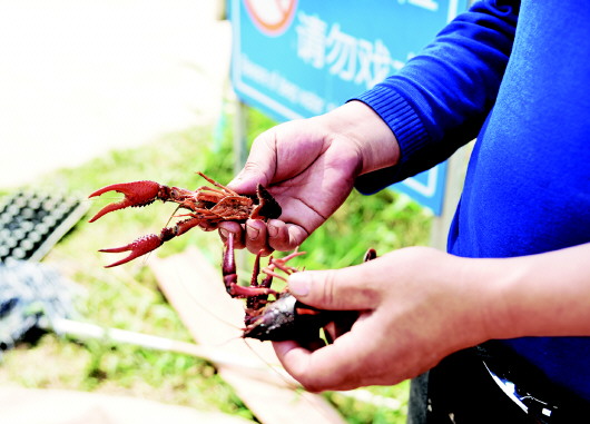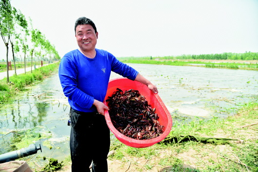 5月8日,德州陵城区金庄村养殖户金德旺刚从池塘里捕捞起的小龙虾。 本报记者 马志勇 摄