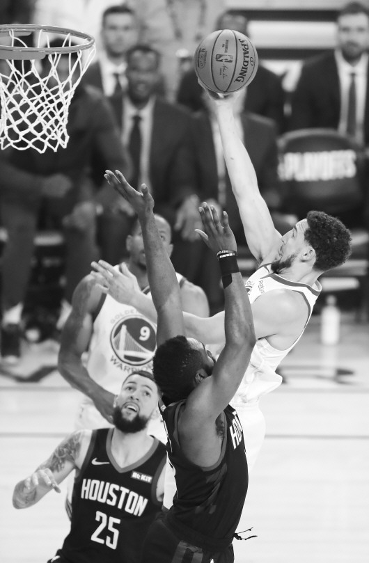 比赛前半段手风不顺的库里,在杜兰特离场后,很快调整进入状态,得到第四节单节12分,只手浇灭了火箭队最后的反扑。