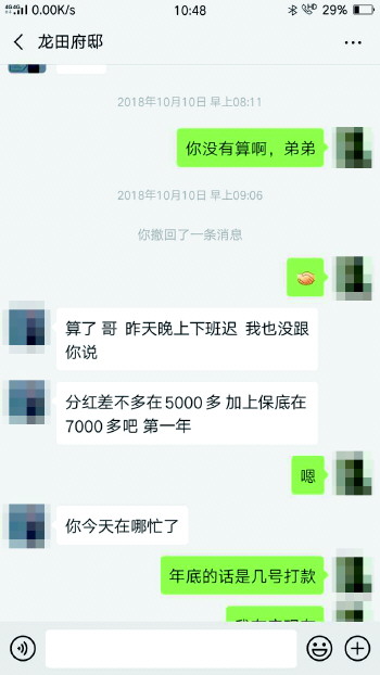 记者看到,当时一名销售人员发给业主的微信,计算收益明确写着“第一年,分红差不多在5000多,加上保底7000多”。记者了解到,听着收益不错,有的业主甚至从银行贷款来买商铺,希望将来能有个养老的保障。
