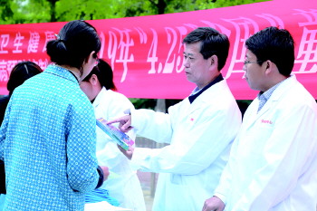 孙艺(右二)为市民科普健康知识。本报记者 黄健恒 摄