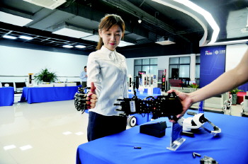 在未来广场5G体验厅,一只酷似钢铁侠的机械手臂吸引了记者的眼球。工作人员一边演示一边告诉记者,这是一只仿生机械手,使用者只要戴上手指套,通过控制自己手指的弯曲程度就能控制机械手做出相应的动作。当其手掌作出弯曲、抓取、点赞、OK等手势时,传感器检测智能手指套发出的肌肉电信号,利用5G低时延的特性,做到人手与机械手动作的完美同步。