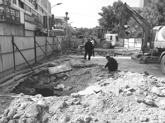5月15日,时隔5天之后,记者再次来到该路段塌方的现场,发现此路段已经完全封闭,禁止机动车通行,而且路面又被挖开两个约5平方米的大坑,抽水机正在源源不断地往外抽水。据现场的施工人员介绍,具体情况他们并不清楚,目前工作是一边排水一边寻找漏点。