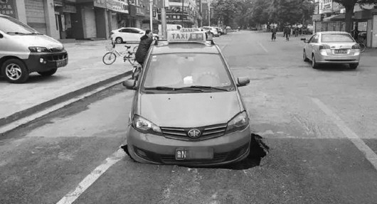 事发是在5月10日,塌陷路段位于新开通的东方红西路与黎明街的交会处。根据市民拍摄的视频信息,一辆行驶中的出租车陷进了坑里。10日,记者来到了路面塌方现场,发现出租车已经离开,地面上约有4平方米的大坑,坑内柏油沥青堆积,并伴有水流,而现场施工人员正在进行紧急抢修。