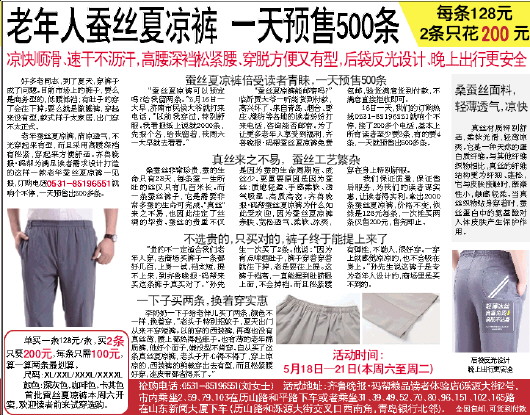 老年蚕丝夏凉裤,清凉透气,不光穿起来有型,而且采用高腰深裆有松紧,穿起来方便舒适。齐鲁晚报·码帮为满足读者需求设计打造的这样一款老年蚕丝夏凉裤一见报,订购电话0531-85196551就响个不停,一天预售出500多条。