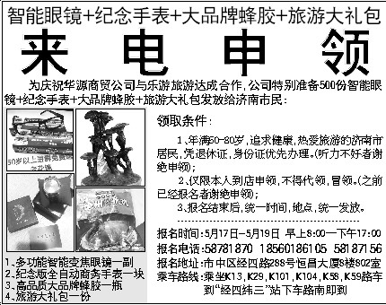 为庆祝华源商贸公司与乐游旅游达成合作,公司特别准备500份智能眼镜+纪念手表+大品牌蜂胶+旅游大礼包发放给济南市民: