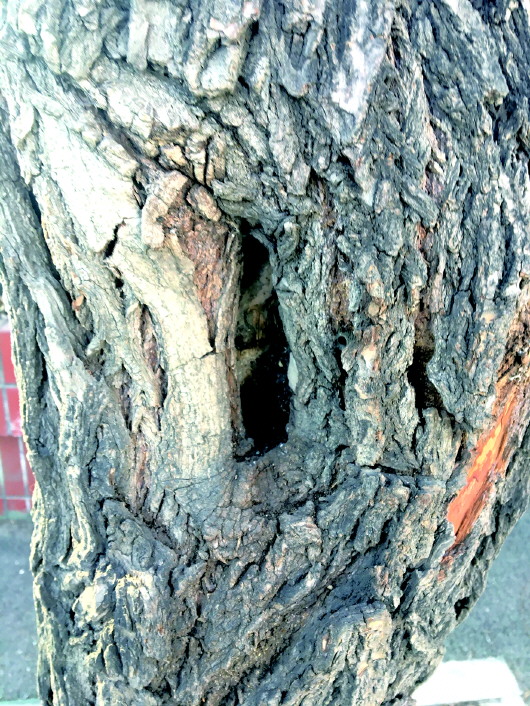 进入小区广场内,南边的确有几根树木被砍后遗留的树桩,直径20厘米左右,大概有10根,其中有些已经发黑,有些中间出现了虫洞,像是之前就已经坏掉的样子。周围还有很多树木,郁郁葱葱的,不少居民在树下乘凉、聊天。