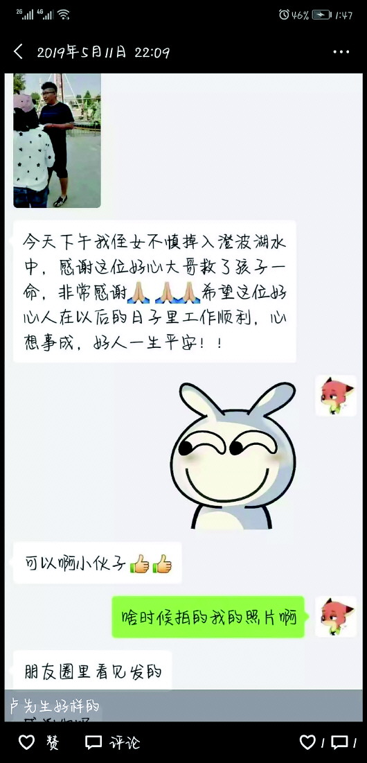“感谢这位好心大哥救了孩子一命,希望这位好心人在以后的日子里心想事成,一生平安!”被救女孩的家人在朋友圈里写道。事迹在网上传开后,许多人都为卢宪政点赞:“卢先生好样的!”“因为有你,初夏的那个午后,虽惊心动魄却分外美丽!”